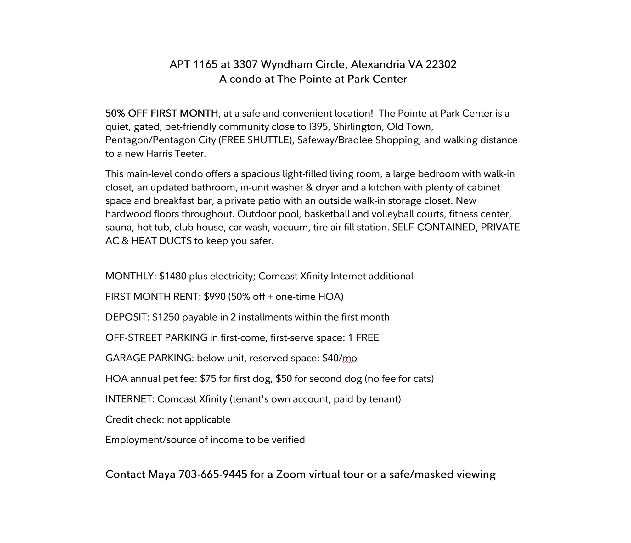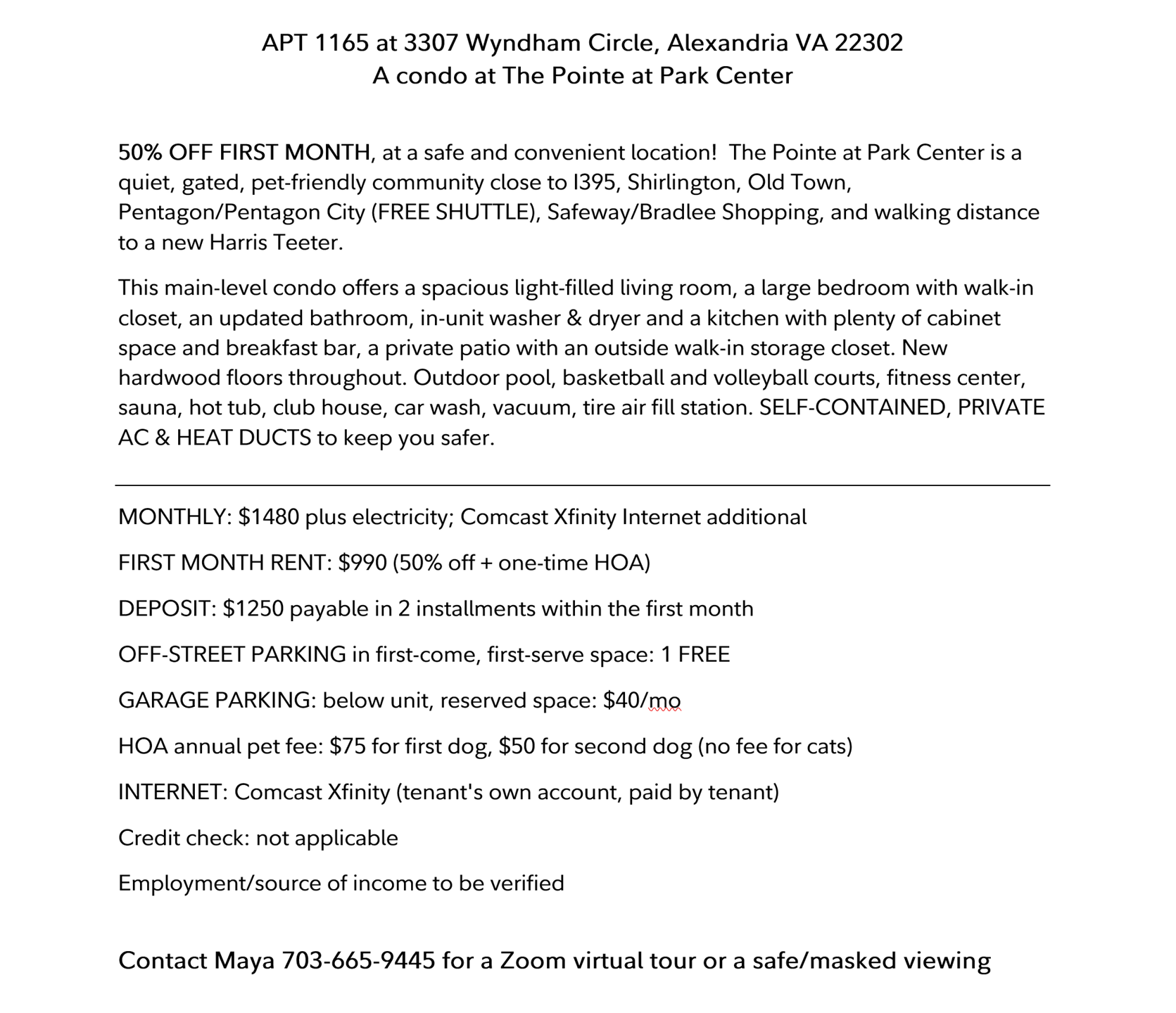 For a Zoom virtual tour or a safe tour with mask, contact Maya 703‐665 - 9445 (text or call)